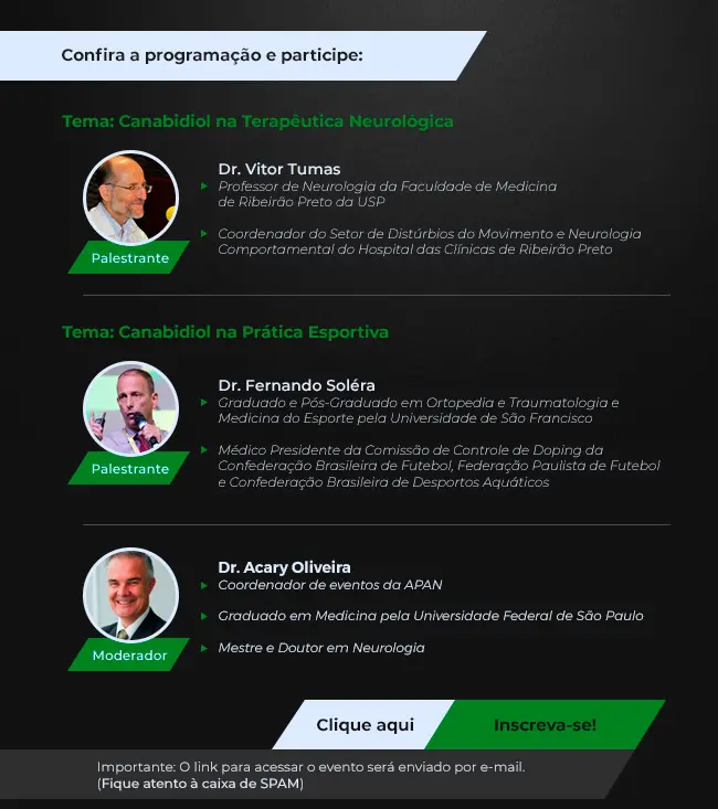 A APAN (Associação Paulista de Neurologia) em parceria com a APM (Associação Paulista de Medicina) estará realizando no dia 8/12 um debate sobre o Canabidiol, focando especialmente na utilização desse medicamento no tratamento terapêutico e não pratica esportiva. As palestras serão apresentadas pelo Prof. Dr. Vitor Tumas (Professor de Neurologia da Faculdade de Medicina de Ribeirão Preto da USP) e pelo Dr. Fernando Soléra (Coordenador da Comissão Médica e de Combate à Dopagem da CBF).
